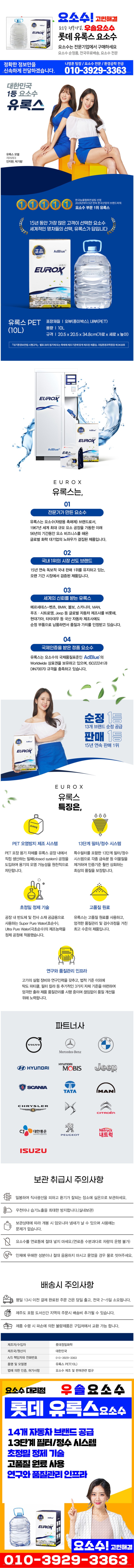 높은 시장 점유율 및 신뢰도: 롯데 유록스는 오랫동안 국내 요소수 시장에서 높은 판매량과 브랜드파워 1위를 유지하며 소비자들에게 꾸준히 신뢰를 받고 있습니다. (7년 연속 한국 산업의 브랜드 파워 조사 요소수 부문 1위, 17년 연속 국내 판매 1위)